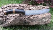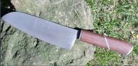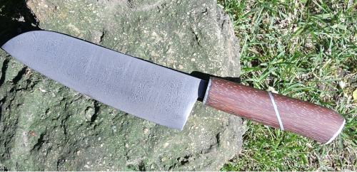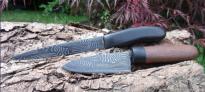 Fleischermesser, Klinge 680 Lagen wilder Damast,Griff Leder, Olivenholz, Messing.Vorne kleines Küchenmesser (Ajikiriform), Griff Teak und Ebenholz.Hinten Brieföffner, Griff Ebenholz.Beide Klingen aus Mosaikdamast.Santoku mit Klinge aus 378 Lagen wildem Damast,Griff Palisander und Aluminium.Für eine größere Darstellung klicken Sie bitte auf eines der Vorschaubilder